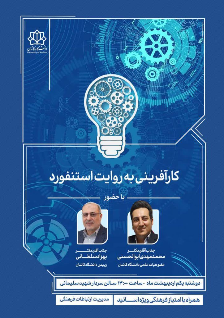 The Stanford-style entrepreneurship knowledge-building session was held with speeches by Dr. Behzad Soltani, President of Kashan University, and Dr. Mohammad Mehdi Abolhasani, a faculty member of Kashan University, 2025 April 20.